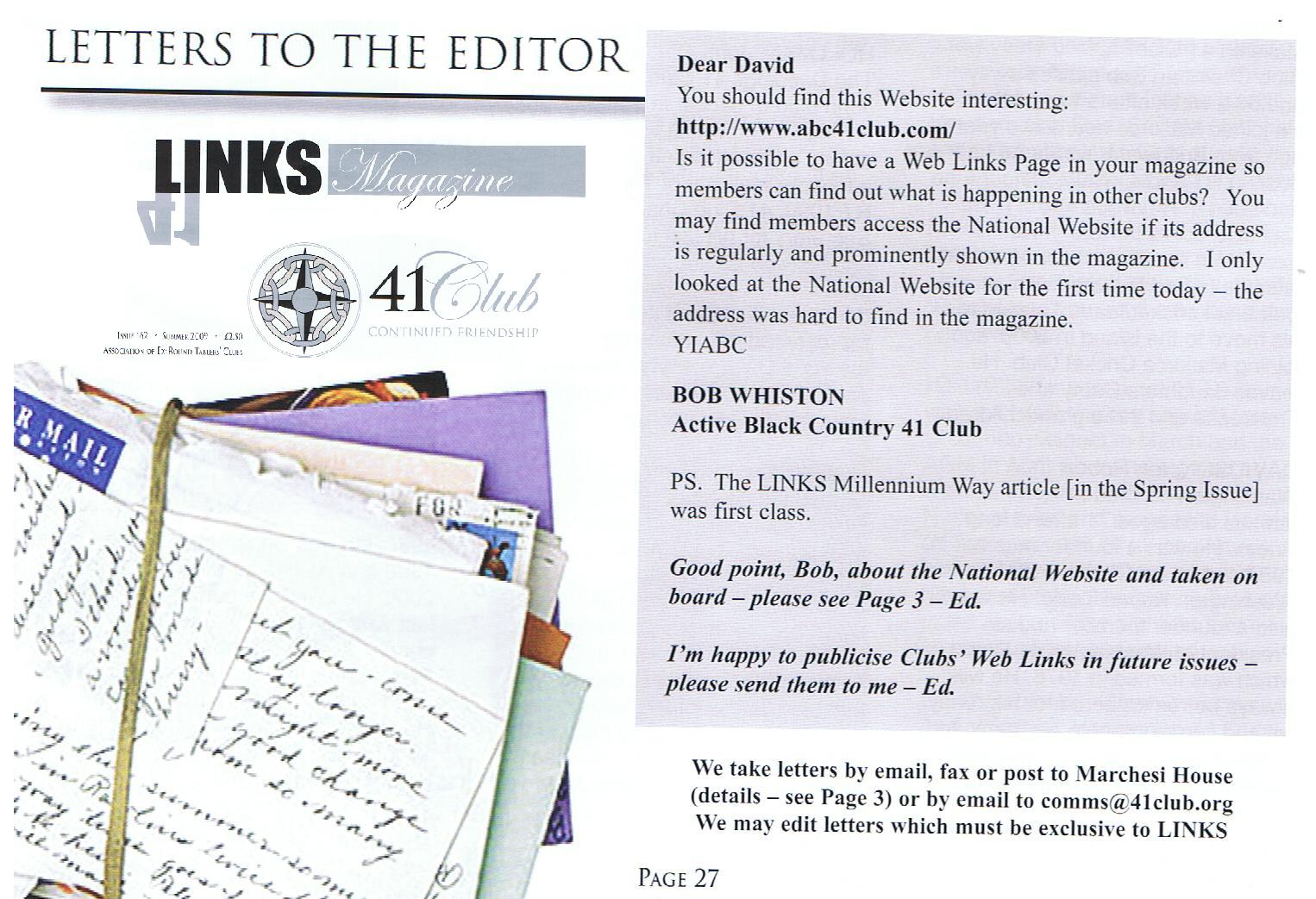 I see our Vice-Chairman Bob Whiston has had an honorable mention again in The Links 41 Club Magazine Winter 2009 Edition: